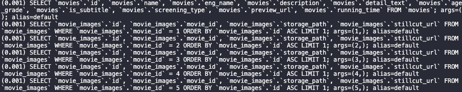 - 처음에 Movie테이블에 존재하는 모든 객체들의 id와 이름을 가져오기 위한 SQL문 + Movie테이블에 존재하는 N개(여기선 5개)객체와 역참조된 대상을 가져오기 위한 SQL문 N개 = N+1개